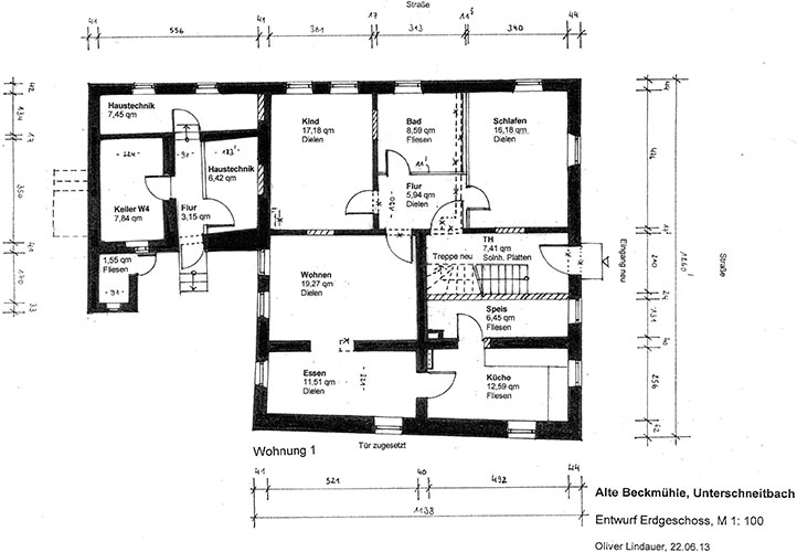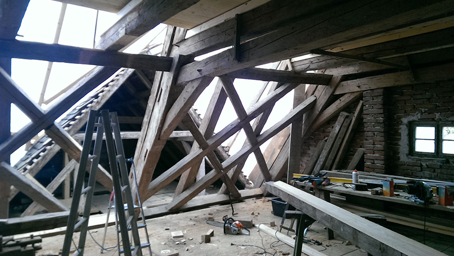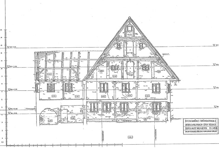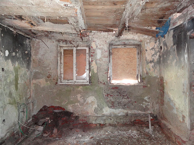 Um der aufsteigenden Feuchtigkeit zu begegnen wurde das Mauerwerk durch den Einbau einer Horizontalsperre im Mauersägeverfahren abgedichtet. Zusätzlich wird eine Bauteiltemperierung im Sockelbereich zur Trockenhaltung beitragen. Der Innenputz im Erdgeschoss musste aufgrund der fortgeschrittenen Durchfeuchtung des Mauerwerks leider fast vollständig abgenommen werden, im Obergeschoss kann er dagegen weitgehend erhalten bleiben. Die Böden im Erdgeschoss werden ausreichend gedämmt, das Dachwerk wurde mit einer Aufdachdämmung versehen, um den historischen Dachstuhl in den ausgebauten Dachräumen wirken zu lassen.